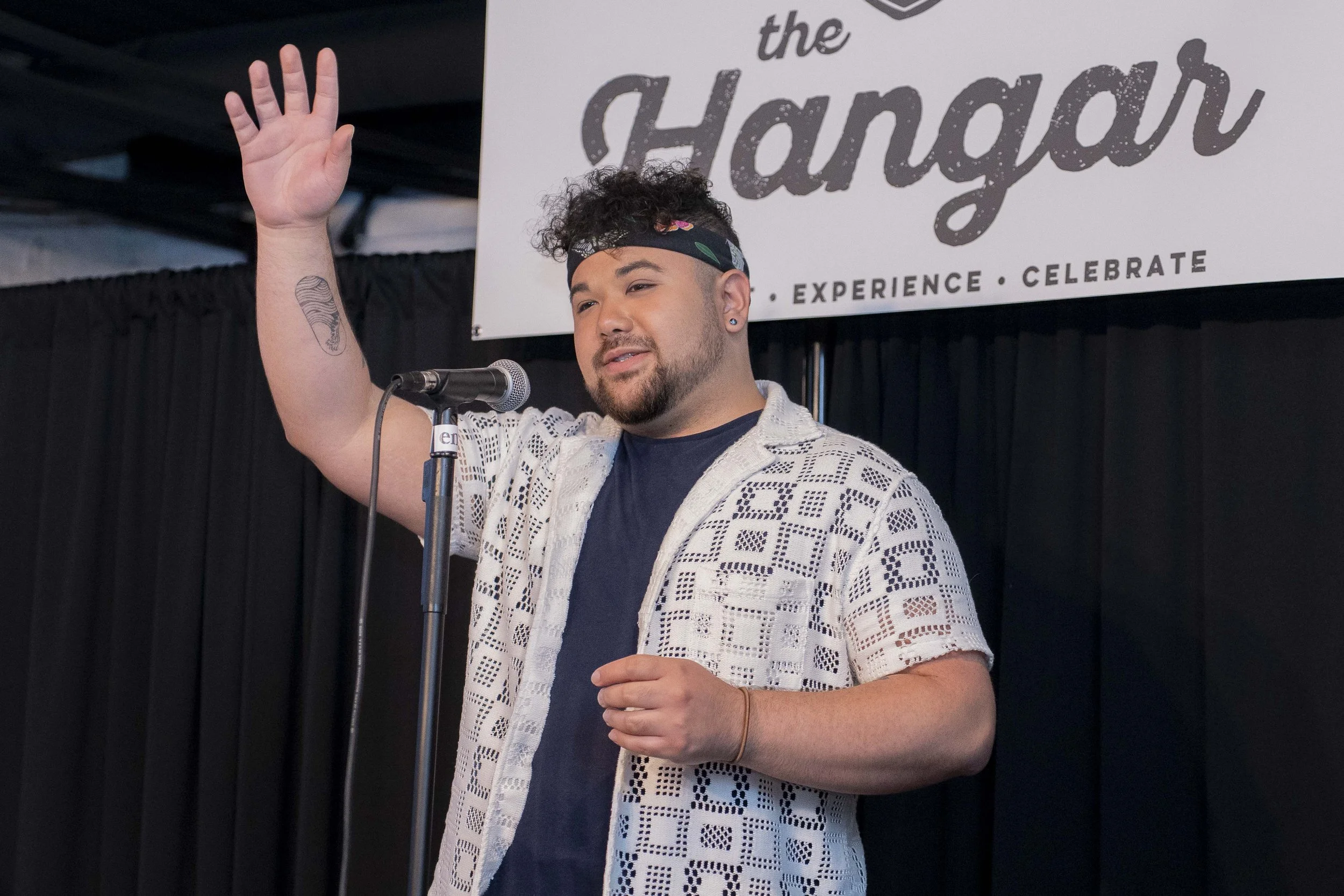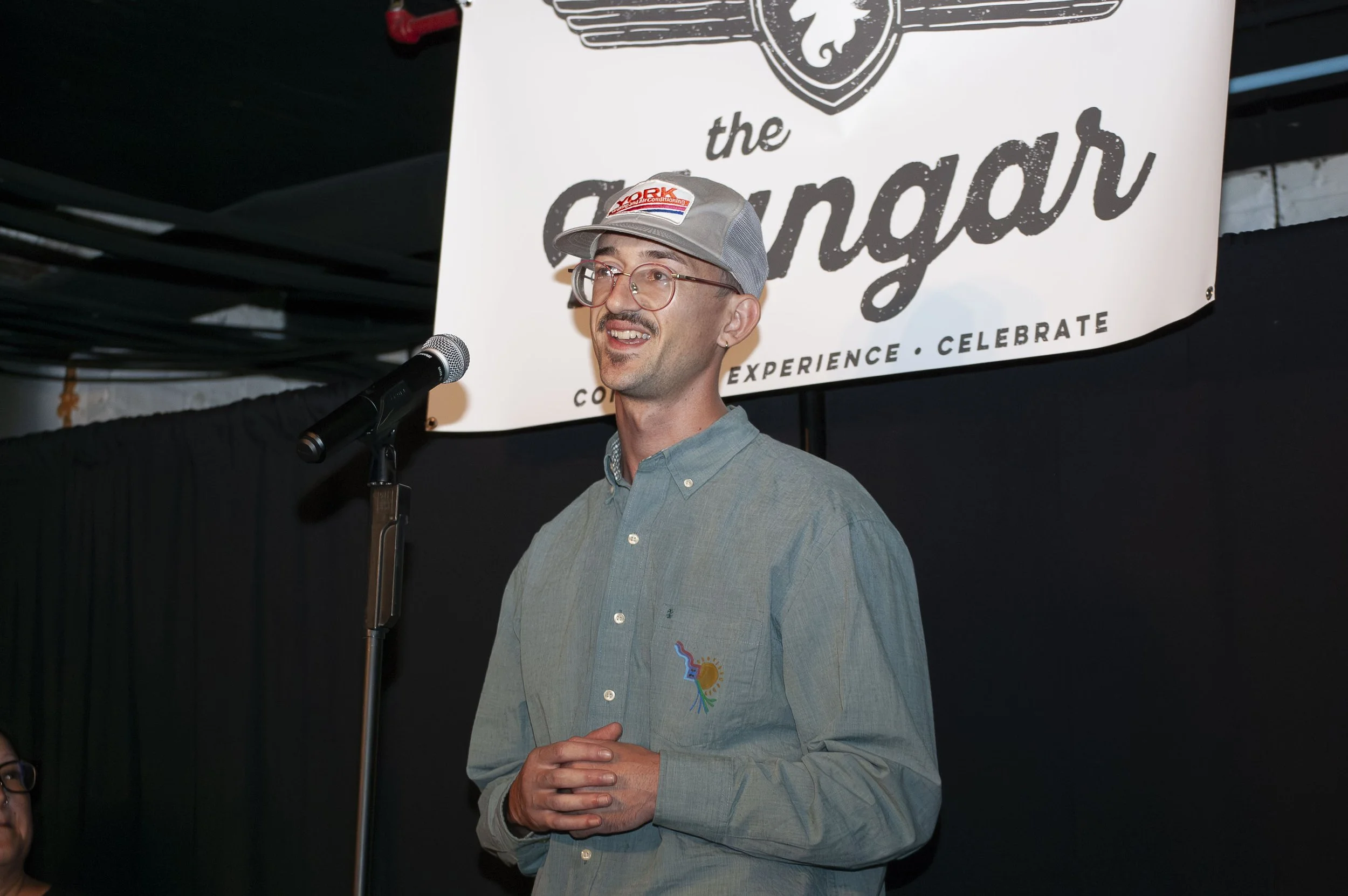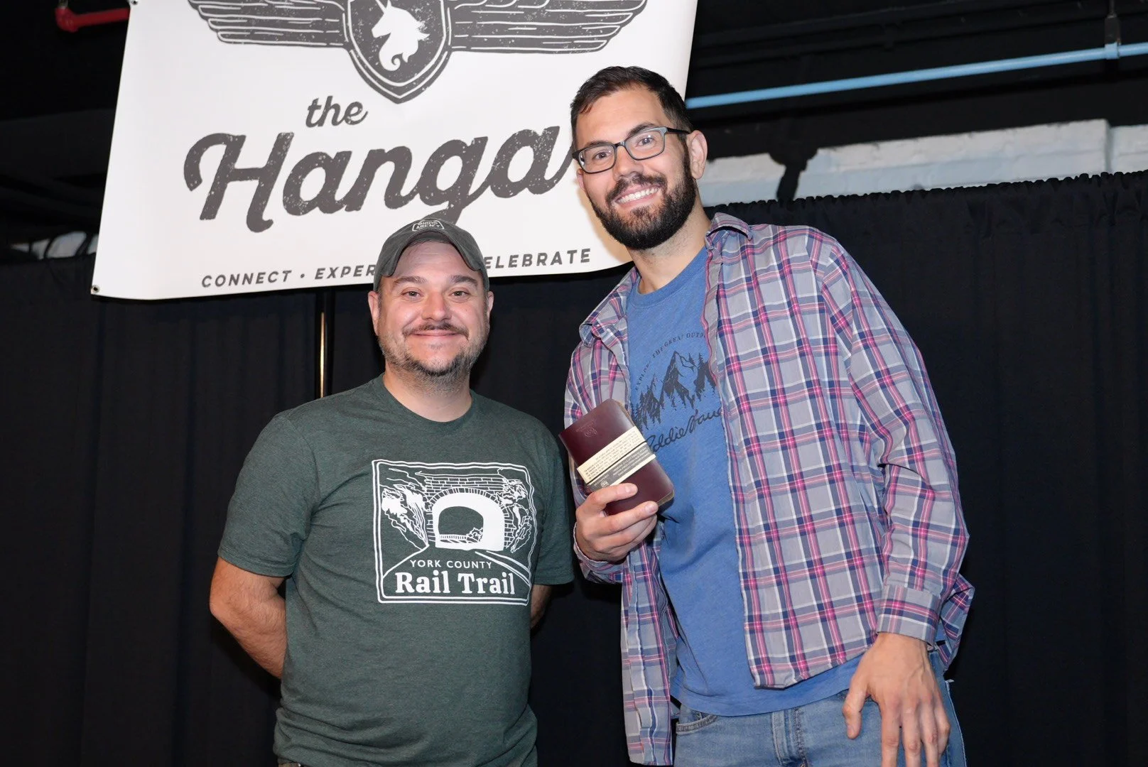 Danton won an exclusive York Story Slam-branded journal from our friends at Story Supply Co and earned the final spot in our Grand Slam in November. Danton (right) is pictured here with this month’s emcee, Mike Pritchard.